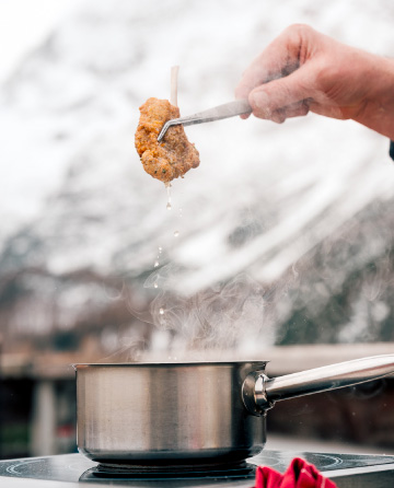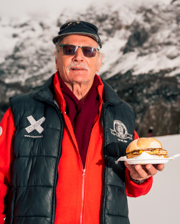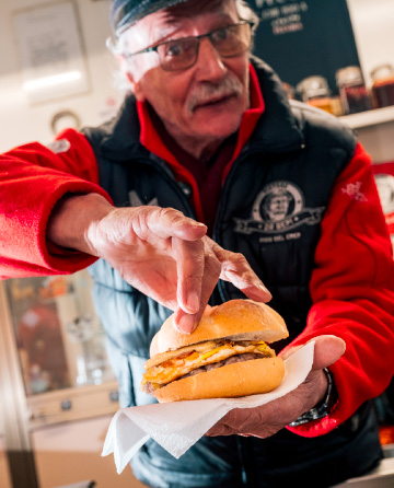 Da Bepi ci sono due certezze: la prima è che la star è Bepi. Subito dopo arriva il suo iconico “panino ludro”. In questo shooting il nostro intento era ritrarre l’anima autentica del rifugio: pochi fronzoli, tanta personalità e sapori che scaldano le giornate in alta quota. Dal punto di vista tecnico, abbiamo lavorato con un mix di luce ambiente e flash, che dà carattere alle immagini e rende il racconto più pop, diretto e riconoscibile.